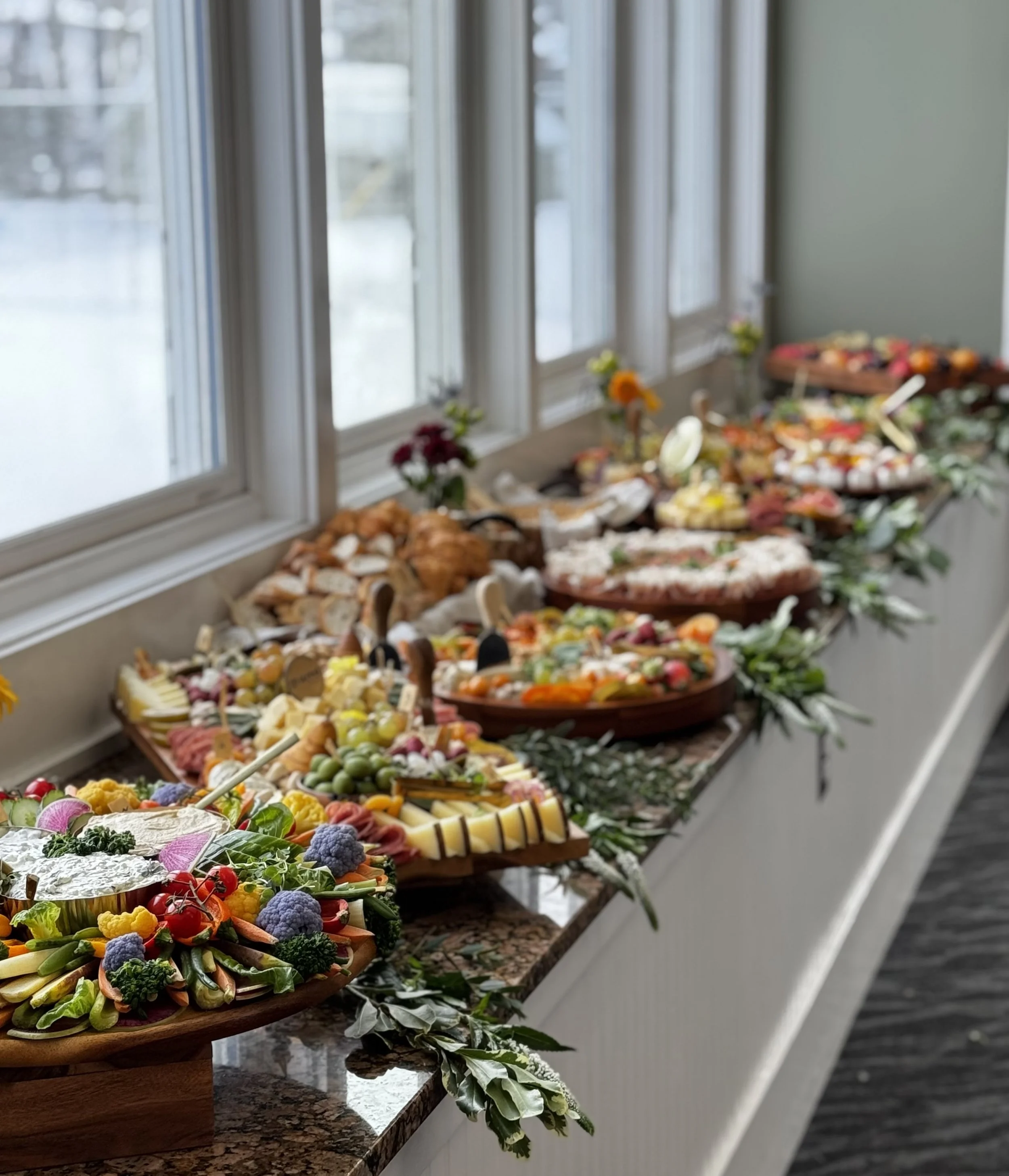 Every table is artfully arranged with a generous selection of artisanal cheeses, gourmet charcuterie, seasonal and dried fruits, crisp crudités, savory olives, pickles, premium nuts, and an assortment of crackers and breads — all thoughtfully curated to indulge the senses and elevate your gathering.